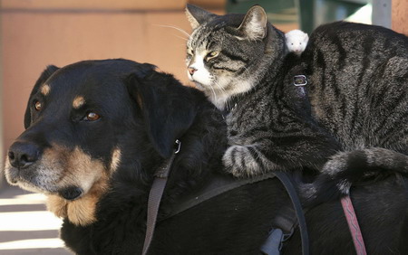 Updated: 2008-02-04 11:59 ![]() Greg Pike's dog Booger, cat Kitty and white mouse Mousie, rest at the end of a day in Bisbee, Arizona, in this file photo taken on December 24, 2006. [Xinhua]