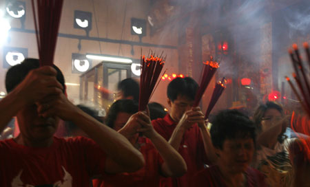 People pray during celebrations for Chinese New Year at Petak Sembilan temple in Jakarta February 7, 2008. The "Year of the Mouse" begins on February 7 in the lunar calendar. [Agencies]