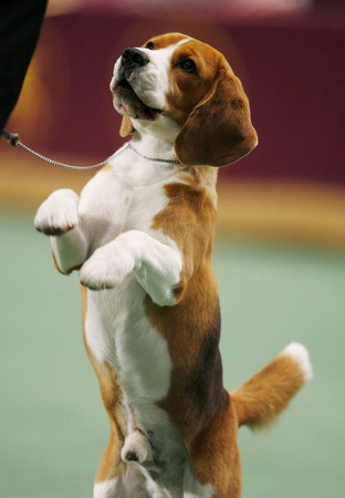 Updated: 2008-02-13 17:00 ![]() Uno, a 15-inch beagle, stands on its hind legs before being declared Best in Show at the 132nd Westminster Kennel Club Dog Show at Madison Square Garden in New York February 12, 2008. [Agencies]