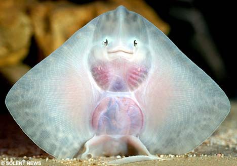 A baby ray that appears to be smiling has brought visitors flocking to a Hampshire aquarium on Feb. 20, 2008. The month-old thornback ray is just 12 centimetres long and is one of a dozen hatched from eggs known as "mermaid's purses". [File photo]