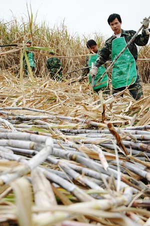 Members of the armed police cut sugarcanes in Shangsi County, southwest China's Guangxi Zhuang Autonomous Region, February 27, 2008. Local residents and armed police were organized to help farmers rush in the harvest of sugarcanes, which were ravaged during the recent snow havoc. [Xinhua]