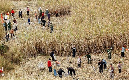People cut sugarcanes in Shangsi County, southwest China's Guangxi Zhuang Autonomous Region, February 27, 2008. Local residents and armed police were organized to help farmers rush in the harvest of sugarcanes, which were ravaged during the recent snow havoc. [Xinhua]