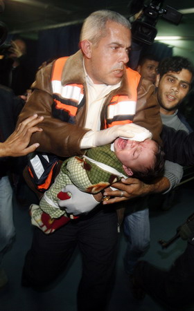 Updated: 2008-02-29 09:21 ![]() Medics carry a wounded boy after an Israeli missile destroyed the Workers Union headquarters in Gaza February 28, 2008. Hamas said an Israeli missile destroyed the main headquarters of the Workers Union in Gaza. [Agencies]