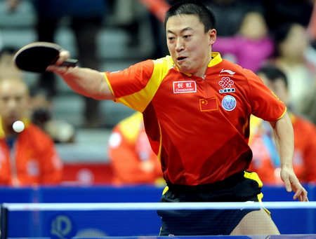 China's Ma Lin returns ball in the match with South Korea's Ryu Seung-min during the men's final of the World Team Table Tennis Championships in the southern city of Guangzhou March 2, 2008. [Agencies]