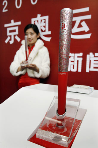 A model poses with a miniature replica of the official Beijing Olympic Torch during its launch in Beijing March 6, 2008. The replica is 29cm long, representing the 29th modern Olympic Games, and is made from excess steel left over from the construction of the National Stadium also known as Bird's Nest. [Agencies]