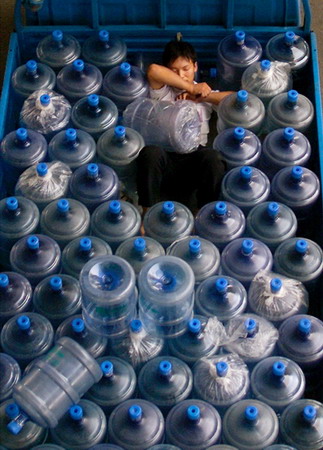 A Chinese worker snoozes amidst bottled drinking water aboard a delivery truck in Shanghai in this August 14, 2001 file photo. [Agencies]