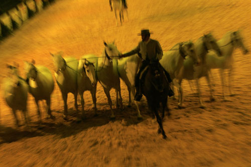 A man performs with thoroughbred horses during the Sacab Andalusian Horse Show in Coin, near the southern Spanish city of Malaga, March 28, 2008. The show will run until March 30. [Agencies]
