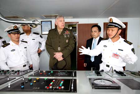 United States Marine Corps Commandant James Conway (C) views the pilothouse of a naval vessel of South China Sea Fleet in Zhanjiang, south China's Guangdong Province, April 2, 2008. James Conway started his two-day visit to South China Sea Fleet on Wednesday.[Xinhua]