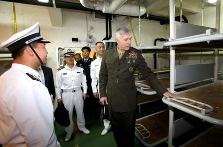 United States Marine Corps Commandant James Conway (R) views marines' cabin of a naval vessel of South China Sea Fleet in Zhanjiang, south China's Guangdong Province, April 2, 2008. [Xinhua]