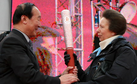 Jiang Xiaoyu (L), the executive vice president of the Beijing Organizing Committee of Olympic Games (BOCOG), gives the torch to Princess Anne during the ceremony in London, capital of Britain, April 6, 2008. London is the fourth stop of the 2008 Beijing Olympic Games torch relay outside the Chinese mainland. [Xinhua]