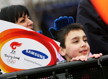 A young spectator watches as the Olympic torch passes during the Olympic torch relay through London April 6, 2008. London is the fourth stop of the 2008 Beijing Olympic Games torch relay outside the Chinese mainland. [Agencies]