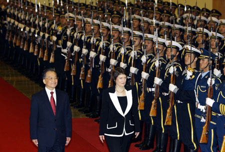 China's Premier Wen Jiabao and New Zealand's Prime Minister Helen Clark (R) review an honour guard during a welcome ceremony at the Great Hall of the People in Beijing April 7, 2008. China and New Zealand signed a free-trade agreement (FTA) in Beijing on Monday, marking the first full trade treaty Beijing has concluded with a developed economy. [Agencies]