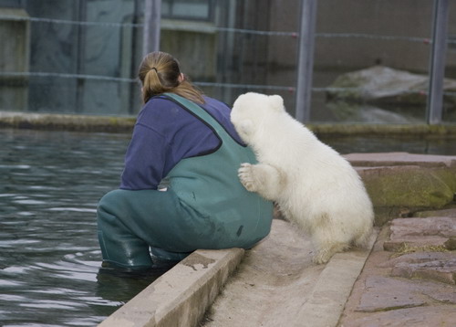 A handout picture shows zookeeper Stefanie Krueger with polar bear cub Flocke (snowflake) for the first time in her new outside enclosure, at the zoo in Nuremberg April 8, 2008. [Agencies]