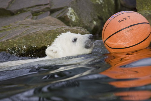 A handout picture shows polar bear cub Flocke (snowflake) for the first time in her new outside enclosure, at the zoo in Nuremberg April 8, 2008. [Agencies]