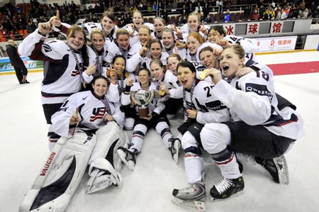 United States players celebrate the victory over Canada of the final match at the 2008 Women's Ice Hockey World Championship held in Harbin, capital of northeast China's Heilongjiang Province, April 12, 2008. [Xinhua]