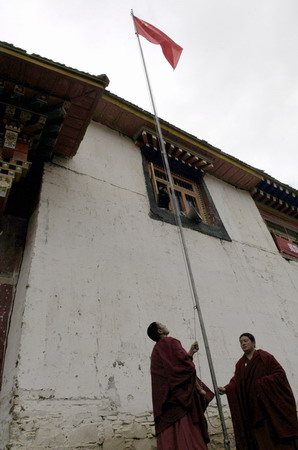 Buddhist monks raise a national flag at the Chali Monastery in Aba County, Southwest China's Sichuan Province, April 14, 2008. The monks raised the Chinese national flag before planting more than 1,000 spruce trees on the hillside Monday, as well as wishing peace and success for the upcoming Beijing Olympic Games. [Xinhua]