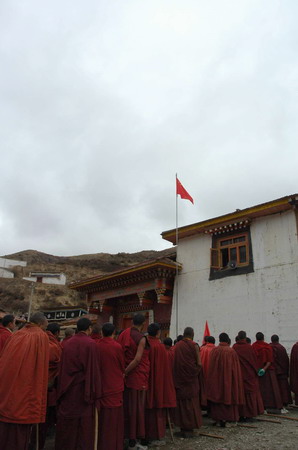 Buddhist monks stand during a national flag-raising ceremony at the Chali Monastery in Aba County, Southwest China's Sichuan Province, April 14, 2008. The monks raised the Chinese national flag before planting more than 1,000 spruce trees on the hillside Monday, as well as wishing peace and success for the upcoming Beijing Olympic Games. [Xinhua]