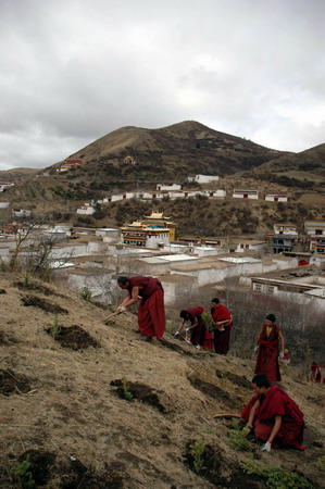 Buddhist monks plant spruce trees on the hillside of the Chali Monastery in Aba County, Southwest China's Sichuan Province, April 14, 2008. The monks raised the Chinese national flag before planting more than 1,000 spruce trees on the hillside Monday, as well as wishing peace and success for the upcoming Beijing Olympic Games. [Xinhua]