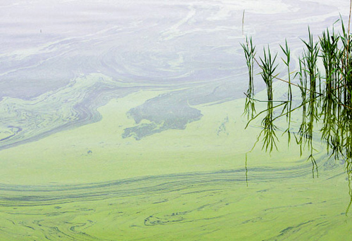 Blue-green algae is seen on the surface of Taihu Lake in this recent photo taken in Yixing, East China's Jiangsu Province. Outbreaks of blue-green algae, which sparked last year's water shortage crisis in Wuxi, Jiangsu Province, may hit Taihu Lake again this summer, say some scientists and top environmental officials. [Xinhua]