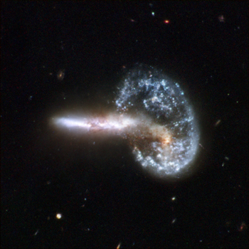 Hubble image of Arp 148 is the staggering aftermath of an encounter between two galaxies, resulting in a ring-shaped galaxy and a long-tailed companion. The collision between the two parent galaxies produced a shockwave effect that first drew matter into the center and then caused it to propagate outwards in a ring. The elongated companion perpendicular to the ring suggests that Arp 148 is a unique snapshot of an ongoing collision. Infrared observations reveal a strong obscuration region that appears as a dark dust lane across the nucleus in optical light. Arp 148 is nicknamed "Mayall's object" and is located in the constellation of Ursa Major, the Great Bear, approximately 500 million light-years away. This interacting pair of galaxies is included in Arp's catalog of peculiar galaxies as number 148. This image is part of a large collection of 59 images of merging galaxies taken by the Hubble Space Telescope and released on the occasion of its 18th anniversary on April 24, 2008. [Agencies]