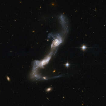 UGC 8335 is a strongly interacting pair of spiral galaxies resembling two ice skaters. The interaction has united the galaxies via a bridge of material and has yanked two strongly curved tails of gas and stars from the outer parts of their "bodies". Both galaxies show dust lanes in their centers. UGC 8335 is located in the constellation of Ursa Major, the Great Bear, about 400 million light-years from Earth. It is the 238th galaxy in Arp's Atlas of Peculiar Galaxies. This image is part of a large collection of 59 images of merging galaxies taken by the Hubble Space Telescope and released on the occasion of its 18th anniversary on 24th April 2008. [Agencies]