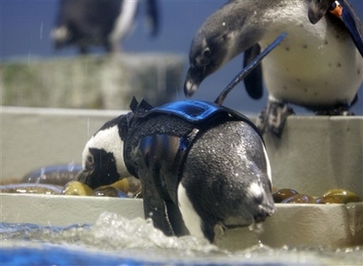 Pierre the Penguin, 25, climbs quickly out of the water while wearing his wetsuit at the Academy of Sciences in San Francisco, Thursday, April 17, 2008. Pierre, who was going bald, began wearing a wetsuit six weeks ago and has begun regrowing his feathers.[Agencies]