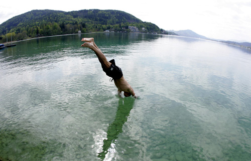 A young man jumps into lake Woerthersee in Klagenfurt April 28, 2008. [Agencies]
