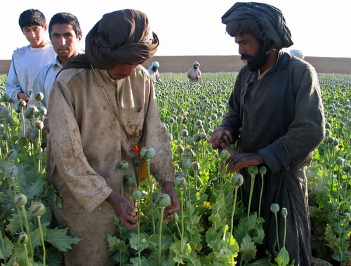 Afghan men work in a poppy field in the southern province of Helmand May 3, 2008. [Agencies]