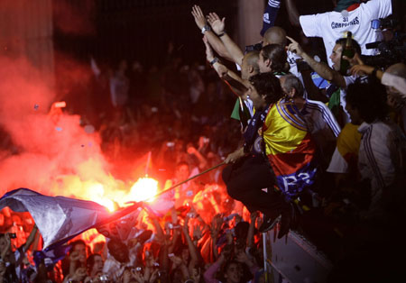 Updated: 2008-05-05 16:45 ![]() Real Madrid players celebrate winning the Spanish league soccer title on top of their bus at Cibeles fountain in central Madrid May 5, 2008. Real Madrid fought their way back after a sending off and going a goal down to snatch a dramatic 2-1 victory at Osasuna and win their 31st Spanish league title on Sunday. [Agencies] |