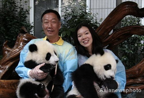 Taiwan tycoon Guo Taiming and an unidentified woman hold a pair of giant panda cubs during a visit to the Giant Panda Breeding Center in Chengdu, Southwest China's Sichuan Province, May 5, 2008. Guo donated 6m yuan to adopt six panda cubs in the breeding center. [Asianewsphoto]