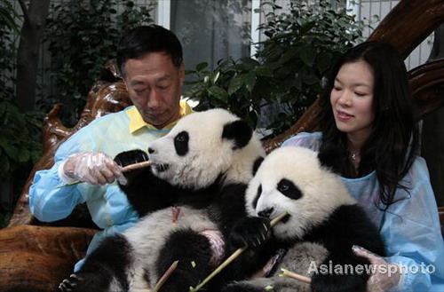 Taiwan tycoon Guo Taiming and an unidentified woman hold a pair of giant panda cubs during a visit to the Giant Panda Breeding Center in Chengdu, Southwest China's Sichuan Province, May 5, 2008. Guo donated 6m yuan to adopt six panda cubs in the breeding center. [Asianewsphoto]