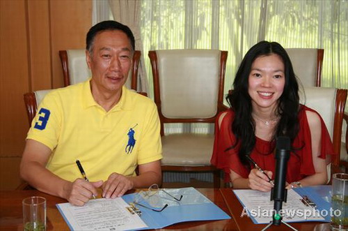 Taiwan tycoon Guo Taiming and an unidentified woman signs on the contract to adopt six giant panda cubs during his visit to the Giant Panda Breeding Center in Chengdu, Southwest China's Sichuan Province, May 5, 2008. Guo donated 6m yuan to adopt six panda cubs in the breeding center. [Asianewsphoto]