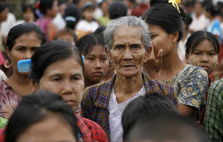 Updated: 2008-05-12 10:15 ![]() Villagers wait for aid in Kaw Hwu near Kundangon, Myanmar May 11, 2008. Even if they manage to find food and shelter, the 1.5 million destitute survivors of Myanmar's Cyclone Nargis still face a major risk from infected wounds, chronic diarrhoea and malaria or dengue. [Agencies]