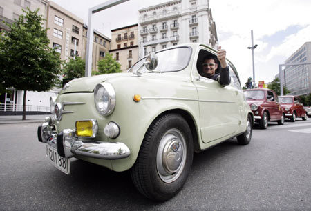Updated: 2008-05-12 10:44 ![]() A driver of a Seat 600 car gestures during a gathering of the car in the northern Spanish town of Zaragoza May 11, 2008. Participants from all over Spain took part in the event, aiming to enter the Guinness World Records. [Agencies]