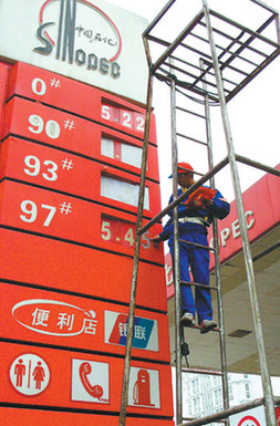 A Sinopec worker replaces the price tags at a gas station in Yichang, Hubei Province, last November. Diesel has been in short supply again in a number of provinces and regions over the past few weeks, with Guangdong, Guizhou and Yunnan being the worst hit.  [China Daily]