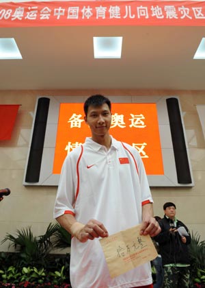 Updated: 2008-05-15 15:15 ![]() Chinese basketball player Yi Jianlian donates 100,000 Yuan (about US$ 14,300) to the earthquake victims during a donation ceremony in Beijing, May 14, 2008. [Xinhua]