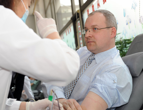 Esthonian Ambassador to China Andres Unga donates blood at the Beijing Red Cross Blood Center for those injured in the deadly Monday earthquake in Southwest China, May 15, 2008. [Xinhua]