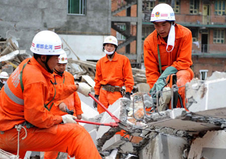 Fire-fighters take part in the rescue operation after Monday's massive earthquake in Nanba Town, Pingwu County, Southwest China's Sichuan Province, May 15, 2008. [Xinhua]