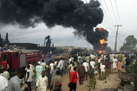 The fireball engulfed homes and schools at Ijegun village in the Lagos district of Alimosho, and many of the dead, who included schoolchildren, were killed in the ensuing stampede as people fled in panic from the flames. "About 100 people have so far been confirmed dead from the fire. We have so far rescued more than 20 people with injuries and taken them to hospital for treatment," a Red Cross official at the scene told Reuters. The disaster was the latest in a series of pipeline explosions or blazes caused by damage or theft which have killed more than 1,200 people since 2000 in Nigeria, the world's eighth largest oil exporter and Africa's top producer. The pipeline rupture at Ijegun, a village about 50 km (30 miles) from the centre of the sprawling coastal city of Lagos, occurred during work to build a road. A bulldozer moving earth struck the pipeline buried beneath the surface. "I was returning home when I suddenly saw sparks of fire from where the grader (earthmover) was working," local resident John Egbowon said. The fuel leaking from the broken pipe caught fire and exploded, sending people fleeing in panic. "Hell raining down" "It was like hell was raining down on us, then everybody started running in different directions," Egbowon said. At least 15 homes were burned. More than 20 charred vehicles caught in the fire were visible afterwards in the street, as firefighters and volunteers tried to douse the flames with sand and water after the explosion. Witnesses said that even after the main explosion, the ground around the fire was so hot that shoes melted. |