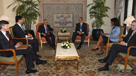 Updated: 2008-05-19 10:27 ![]() US President George W. Bush (3rd R) meets with Palestinian Authority Prime Minister Salam Fayad (3rd L) while US Secretary of State Condoleezza Rice (2nd R), US National Security Advisor Stephen Hadley (R) and Director General of the Palestinian police Hazem Attalah (2nd L) look on in Sharm El-Sheikh, May 18, 2008. [Agencies]