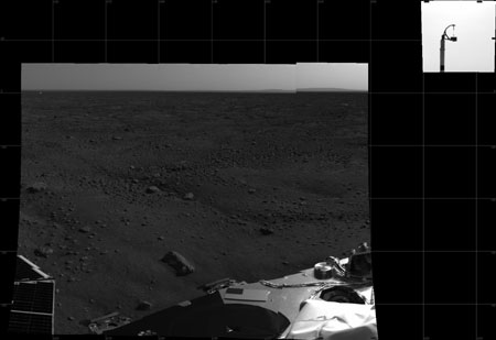 Updated: 2008-05-27 20:50 ![]() Individual images taken by the Surface Stereo Imager Right on NASA's Phoenix Mars Lander at the Phoenix site near Mars' north pole May 26, 2008 are combined into this view. [Agencies]