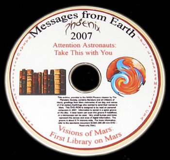Updated: 2008-05-27 20:50 ![]() This Phoenix mini-DVD, made of silica glass launched in August 2007 on its way to Mars on the spacecraft Phoenix, is seen in this undated publicity photograph. It is encoded with a collection of scientific and science-fiction texts about Mars, depictions of Mars in art and messages to future settlers of Mars. Also included are 250,000 names of Planetary Society members and others who signed up to send their name to Mars. [Agencies]