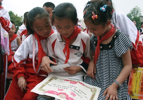 Updated: 2008-05-30 21:53 ![]() Ouyang Ruke, a girl from earthquake-hit Guanghan city of Southwest China's Sichaun Province, shares her commendation with two of her new classmates in Fuquan city in Guizhou Province, May 29, 2008. [Xinhua]