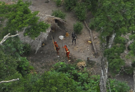 Updated: 2008-05-30 20:23 ![]() Members of an unknown Amazon Basin tribe and their dwellings are seen during a flight over the Brazilian state of Acre along the border with Peru in this May, 2008 photo distributed by Survival International. [Agencies]