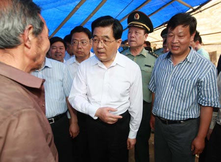 Updated: 2008-05-31 22:08 ![]() Chinese President Hu Jintao (C) talks with quake survivors in Jinshansi Village, Guangping Town, Ningqiang County, Northwest China's Shaanxi Province, May 31, 2008. Hu Jintao arrived in Shaanxi Province on Saturday morning to oversee quake relief operations. [Xinhua]