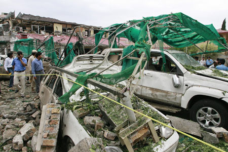 Updated: 2008-06-02 19:50 ![]() People gather at the site of a blast outside the Danish embassy in Islamabad June 2, 2008. [Agencies]