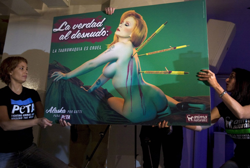 Workers hold up a poster showing Spanish singer Alaska posing naked for an anti-bullfighting advertising campaign sponsored by an animal rights group at the campaign launch in Madrid, June 2, 2008. Poster reads "The naked truth: Bullfighting is cruel". [Agencies]