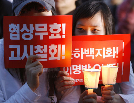 Updated: 2008-06-04 22:42 ![]() People fearing infection of mad cow disease chant slogans at a candle-light vigil in central Seoul June 4, 2008. People demanded full-scale renegotiation of beef deal with the US and resignation of President Lee Myung-bak. A sign (L) reads,"Agreement is invalid!". [Agencies]