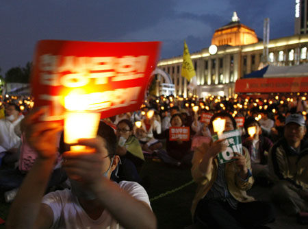 Updated: 2008-06-04 22:42 ![]() People fearing infection of mad cow disease chant slogans during a candle light vigil in central Seoul June 4, 2008. People demanded full-scale renegotiation of beef deal with the US and resignation of President Lee Myung-bak. A sign (L) reads "Agreement is invalid". [Agencies]