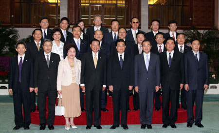 Updated: 2008-06-13 21:08 ![]() General Secretary of the Communist Party of China Central Committee Hu Jintao (4th R, front) and Chiang Pin-kun (5th R, front), chairman of the Taiwan-based Straits Exchange Foundation (SEF), pose for a group photo after their meeting in Beijing June 13, 2008. [Xinhua]